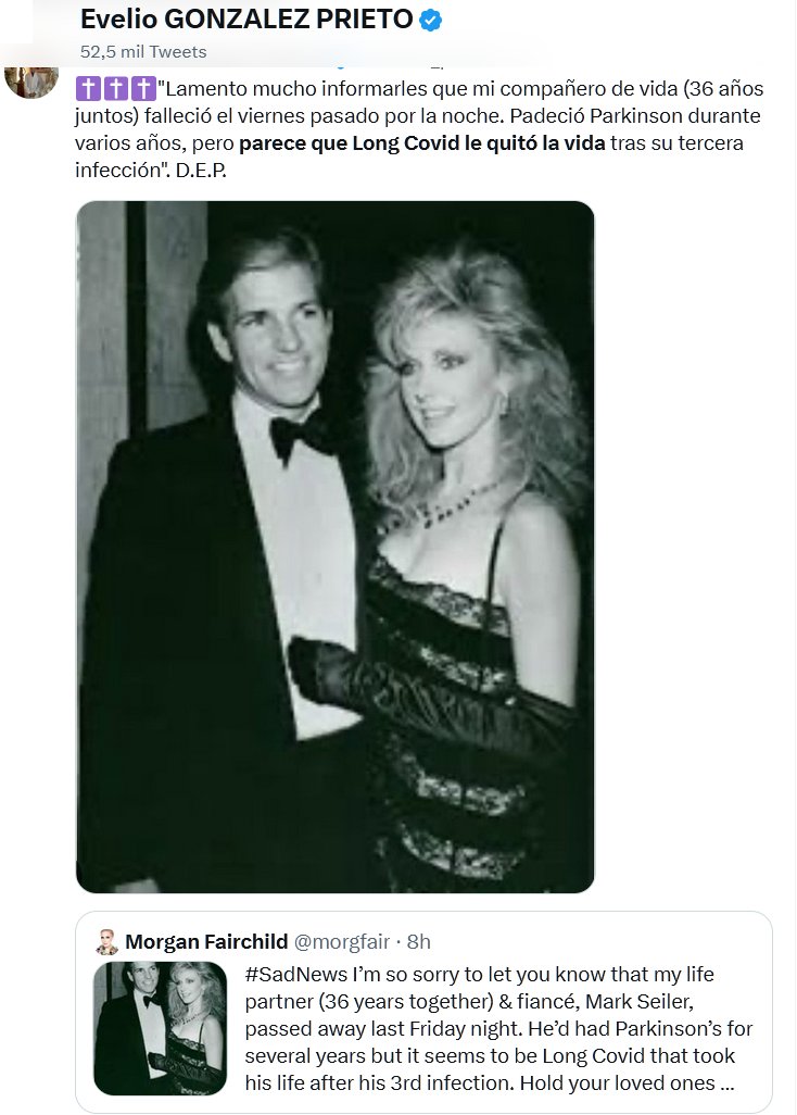 TESTIMONIOS Morgan Fairchild : ✝️✝️✝️»Lamento mucho informarles que mi compañero de vida (36 años juntos) falleció el viernes pasado por la noche. Padeció Parkinson durante varios años, pero parece que Long Covid le quitó la vida tras su tercera infección». D.E.P.