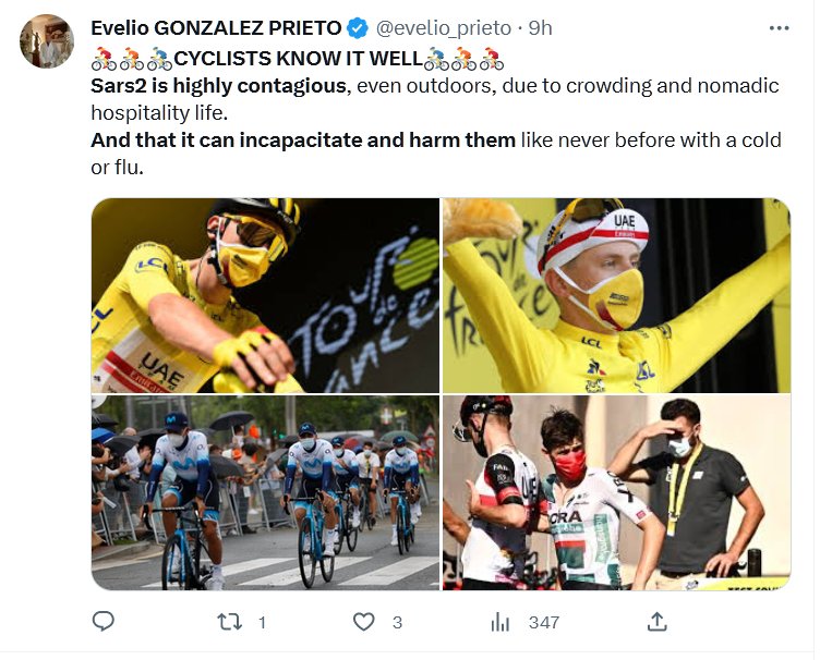 EN INGLÉS 🚴‍♀️🚴🚴‍♂️LOS CICLISTAS LO SABEN BIEN🚴‍♂️🚴🚴‍♀️ Sars2 es altamente contagioso, incluso al aire libre, debido al hacinamiento y la vida hospitalaria nómada. Y que puede incapacitarlos y hacerles daño como nunca antes con un resfriado o una gripe.