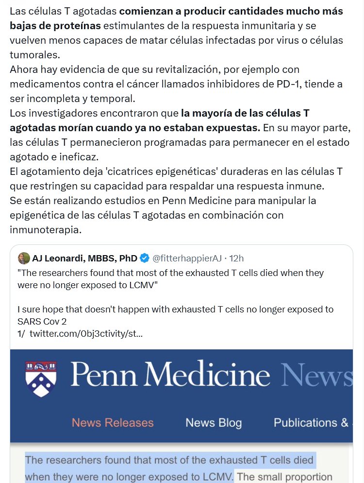 🟥EL PROBLEMA DEL AGOTAMIENTO DE LAS CÉLULAS T🟥 (Cada día se descuben más cosas que dejan en ridículo a nuestros tabernarios catedráticos premiados por su colaboración televisiva para que la gente se reinfecte en masa) Investigadores de la Univ de Pensilvania han revelado una limitación importante del sistema inmunitario en las batallas prolongadas contra el cáncer o los virus
