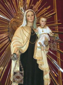 En los primeros siglos, los carmelitas celebraban como Patrona principal de la Orden a la Virgen bajo advocaciones como la Anunciación o la Asunción, la fiesta principal de la Orden era el 15 de agosto. Pero entre 1376 y 1386, se estableció la costumbre de celebrar una fiesta especial de la Virgen para conmemorar la aprobación de la Regla por el papa Honorio III en 1226. La fecha escogida fue el 16 de julio porque la tradición de la Orden narraba que ese día del año 1256, a san Simón Stock se le apareció en Cambridge, Inglaterra, la propia Virgen María con el famoso «escapulario marrón», y le dijo «Toma amado hijo este escapulario de vuestra orden como símbolo de mi confraternidad y especial signo de gracia para vos y todos los Carmelitas; quienquiera que muera en este prenda, no sufrirá el fuego eterno. Es el signo de salvación, defensor en los peligros, prenda de la paz y de esta alianza».