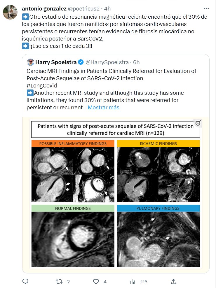 ➡️Otro estudio de resonancia magnética reciente encontró que el 30% de los pacientes que fueron remitidos por síntomas cardiovasculares persistentes o recurrentes tenían evidencia de fibrosis miocárdica no isquémica posterior a SarsCoV2, ➡️¡¡Eso es casi 1 de cada 3!!