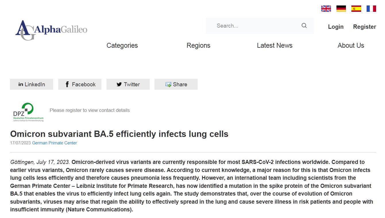 EN INGLÉS La subvariante BA.5 de Omicron infecta eficazmente las células pulmonares Posted on julio 17, 2023 por coronado https://www.alphagalileo.org/en-gb/Item-Display/ItemId/235642?returnurl=https://www.alphagalileo.org/en-gb/Item-Display/ItemId/235642