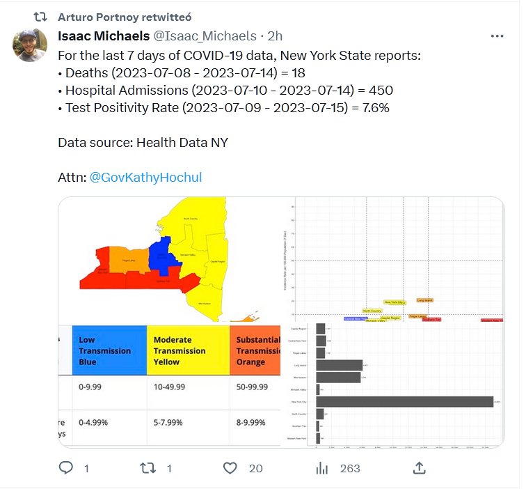 EN INGLÉS Para los últimos 7 días de datos de COVID-19, el estado de Nueva York informa: • Muertes (2023-07-08 – 2023-07-14) = 18 • Admisiones hospitalarias (2023-07-10 – 2023-07-14) = 450 • Tasa de positividad de la prueba (2023-07-09 – 2023-07-15) = 7,6 % Fuente de datos: Datos de salud NY