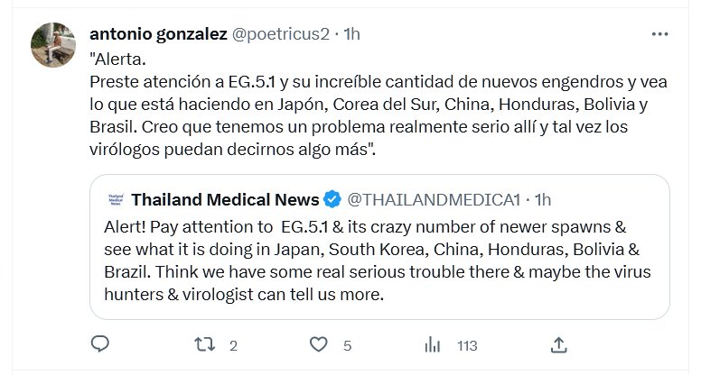 ESTAMOS A UNA NUEVA VARIANTE DE UNA NUEVA PANDEMIA «Alerta. Preste atención a EG.5.1 y su increíble cantidad de nuevos engendros y vea lo que está haciendo en Japón, Corea del Sur, China, Honduras, Bolivia y Brasil. Creo que tenemos un problema realmente serio allí y tal vez los virólogos puedan decirnos algo más».