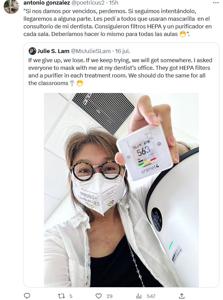 TESTIMONIOS «Si nos damos por vencidos, perdemos. Si seguimos intentándolo, llegaremos a alguna parte. Les pedí a todos que usaran mascarilla en el consultorio de mi dentista. Consiguieron filtros HEPA y un purificador en cada sala. Deberíamos hacer lo mismo para todas las aulas 😷».