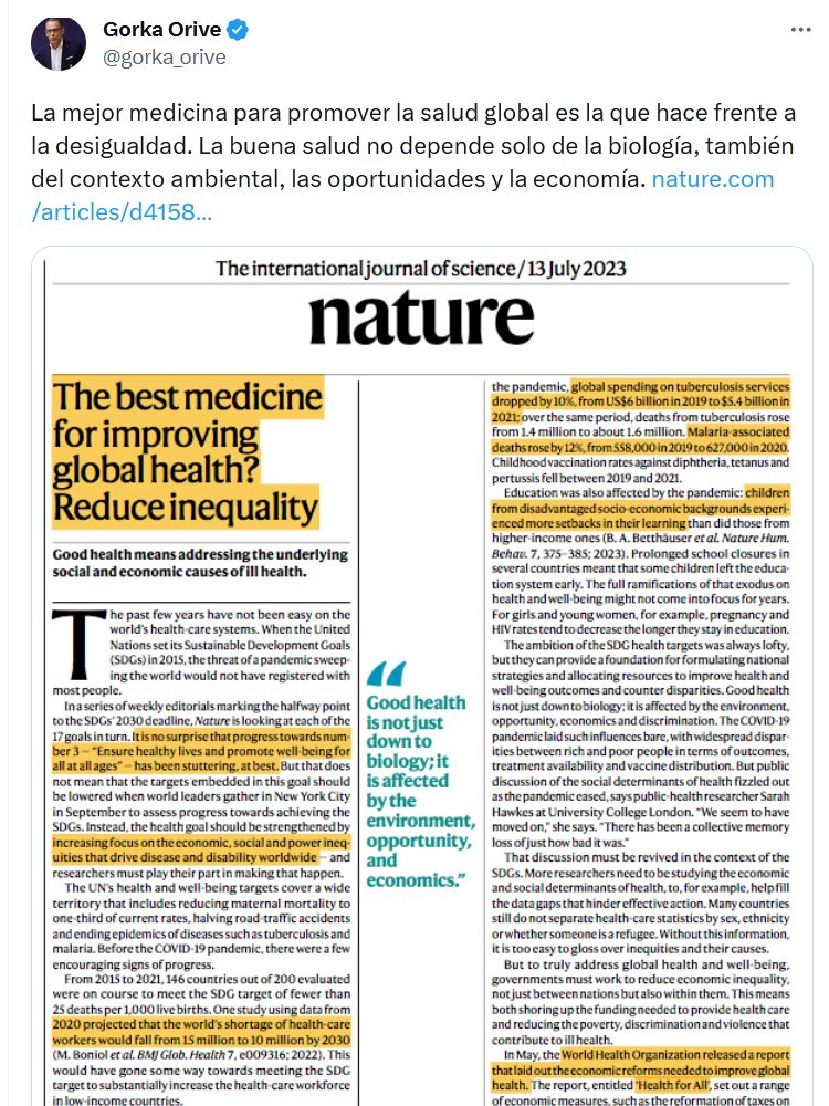 VERDAD ANTIVIRAL Gorka Orive @gorka_orive La mejor medicina para promover la salud global es la que hace frente a la desigualdad. La buena salud no depende solo de la biología, también del contexto ambiental, las oportunidades y la economía.