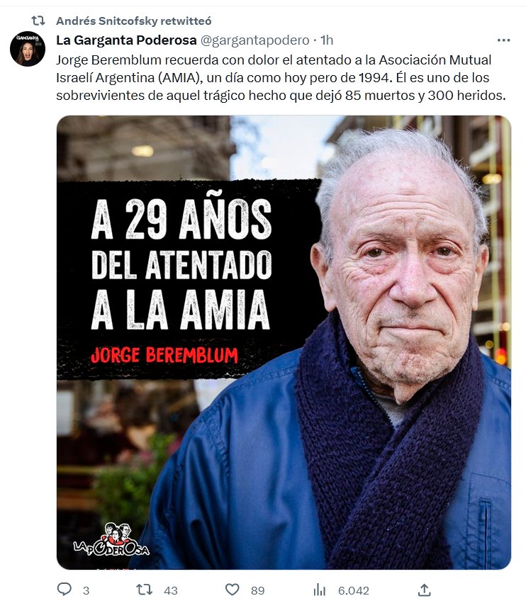 ES VIRAL: 1955, 1994, LOS DOS BOMBARDEOS A BUENOS AIRES Jorge Beremblum recuerda con dolor el atentado a la Asociación Mutual Israelí Argentina (AMIA), un día como hoy pero de 1994. Él es uno de los sobrevivientes de aquel trágico hecho que dejó 85 muertos y 300 heridos.