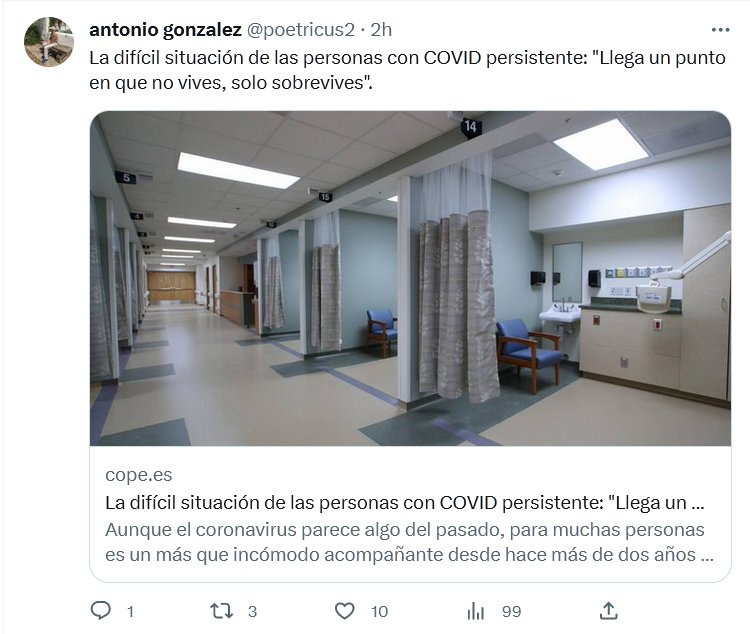 La difícil situación de las personas con COVID persistente: «Llega un punto en que no vives, solo sobrevives». Posted on julio 18, 2023 por coronado https://www.cope.es/programas/la-tarde/noticias/dificil-situacion-las-personas-con-covid-persistente-llega-punto-que-vives-solo-sobrevives-20230718_2819788