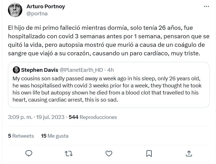 TESTIMONIOS El hijo de mi primo falleció mientras dormía, solo tenía 26 años, fue hospitalizado con covid 3 semanas antes por 1 semana, pensaron que se quitó la vida, pero autopsia mostró que murió a causa de un coágulo de sangre que viajó a su corazón, causando un paro cardíaco, muy triste.