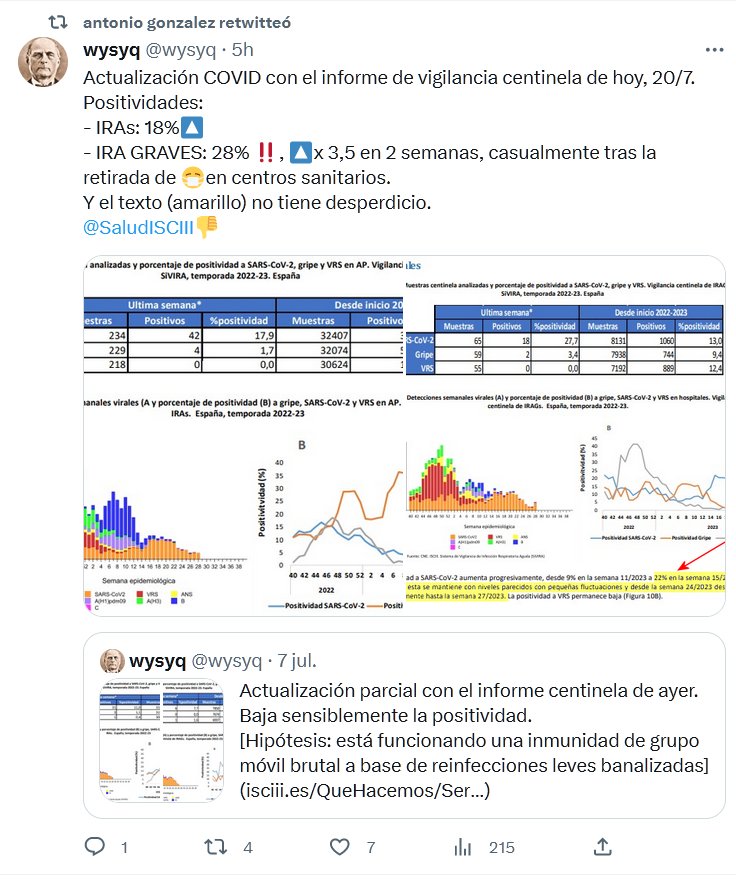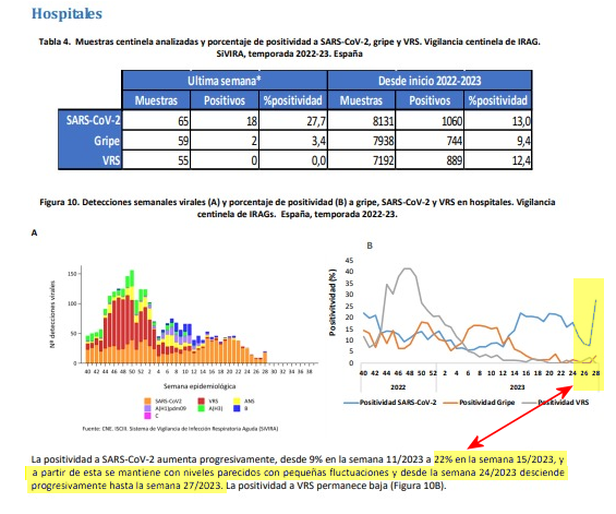 Actualización COVID con el informe de vigilancia centinela de hoy, 20/7. Positividades: – IRAs: 18%🔼 – IRA GRAVES: 28% ‼️, 🔼x 3,5 en 2 semanas, casualmente tras la retirada de 😷en centros sanitarios. Y el texto (amarillo) no tiene desperdicio.