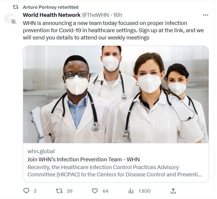 EN INGLÉS World Health Network @TheWHN WHN anuncia hoy un nuevo equipo centrado en la prevención adecuada de infecciones por Covid-19 en entornos de atención médica. Regístrese en el enlace y le enviaremos los detalles para asistir a nuestras reuniones semanales.