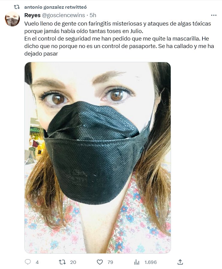 HAY QUE TENER PERSONALIDAD, SI ERES OVEJA PUEDES TERMINAR ASADA! Vuelo lleno de gente con faringitis misteriosas y ataques de algas tóxicas porque jamás había oído tantas toses en Julio. En el control de seguridad me han pedido que me quite la mascarilla. He dicho que no porque no es un control de pasaporte. Se ha callado y me ha dejado pasar