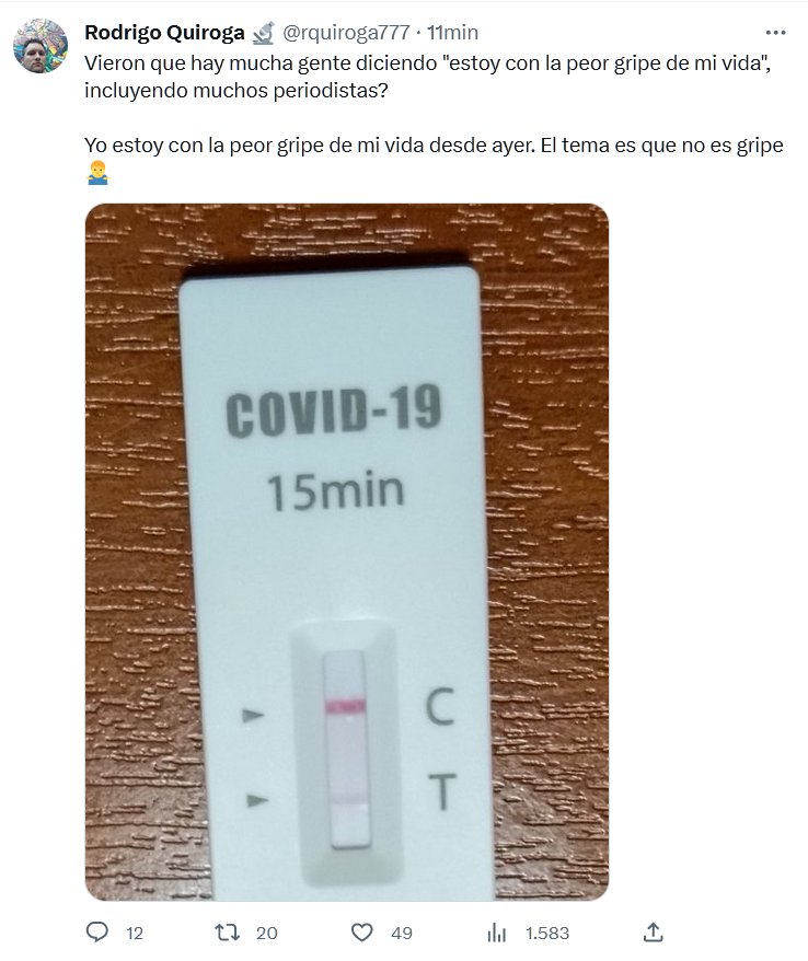 VOLVIÓ LA GRIPALIZACIÓN Dr. Rodrigo Quiroga: Vieron que hay mucha gente diciendo «estoy con la peor gripe de mi vida», incluyendo muchos periodistas? Yo estoy con la peor gripe de mi vida desde ayer. El tema es que no es gripe 🤷♂️ (ES COVID)