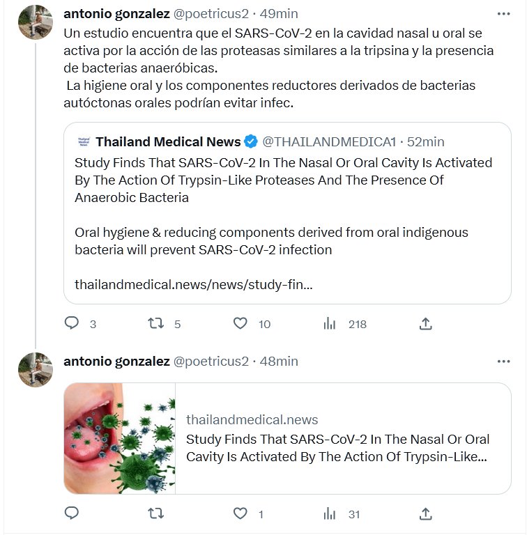 Un estudio encuentra que el SARS-CoV-2 en la cavidad nasal u oral se activa por la acción de las proteasas similares a la tripsina y la presencia de bacterias anaeróbicas. La higiene oral y los componentes reductores derivados de bacterias autóctonas orales podrían evitar infecCIÓN