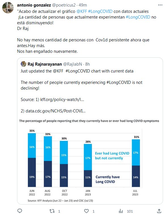 «Acabo de actualizar el gráfico @KFF #LongCOVID con datos actuales ¡La cantidad de personas que actualmente experimentan #LongCOVID no está disminuyendo! Dr Raj No hay menos cantidad de personas con Covid persistente ahora que antes. Hay más. Nos han engañado nuevamente.»