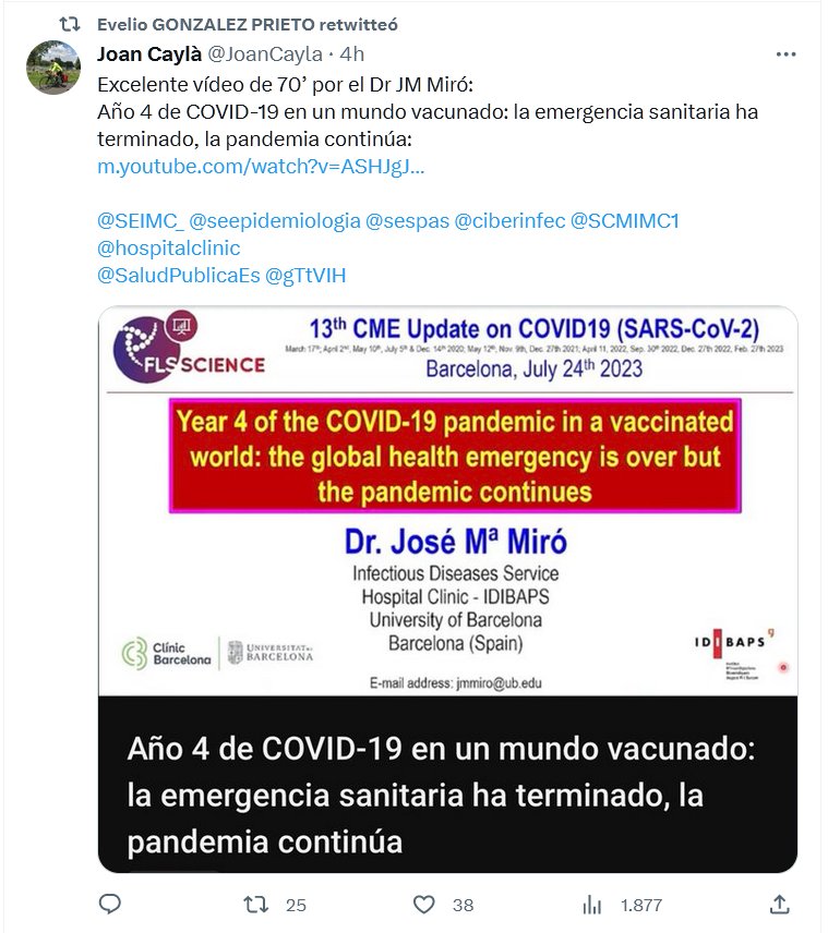 Excelente vídeo de 70’ por el Dr JM Miró: Año 4 de COVID-19 en un mundo vacunado: la emergencia sanitaria ha terminado, la pandemia continúa Posted on julio 26, 2023 por coronado https://youtu.be/ASHJgJH000s