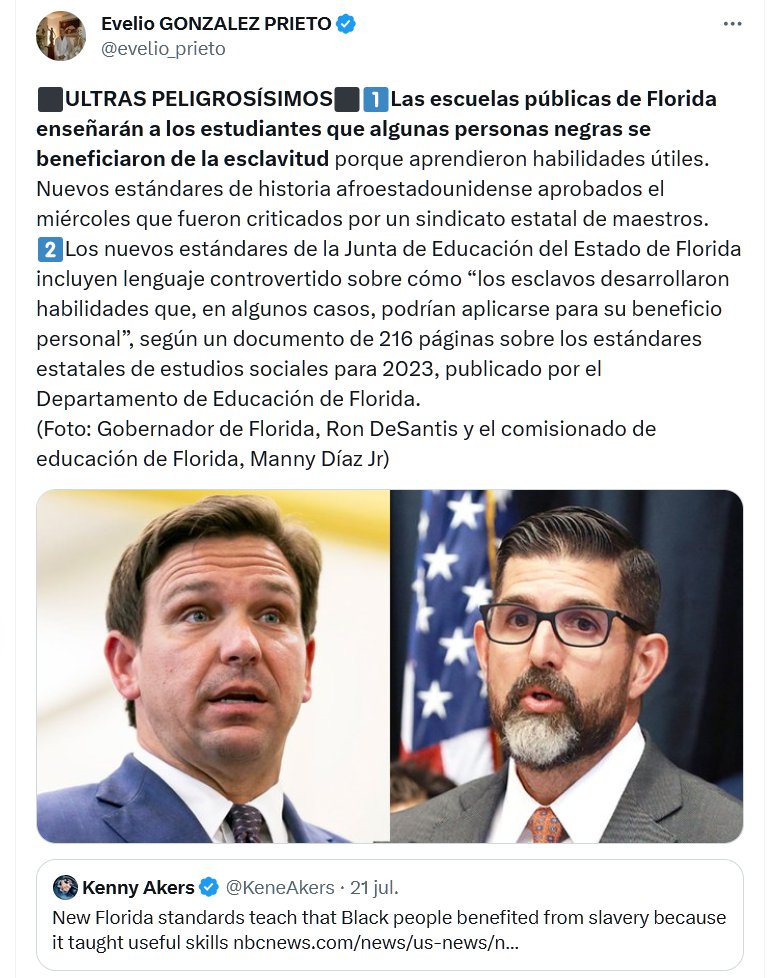 OESTE IMPERIO DEL MAL ⬛️ULTRAS PELIGROSÍSIMOS⬛️1⃣Las escuelas públicas de Florida enseñarán a los estudiantes que algunas personas negras se beneficiaron de la esclavitud porque aprendieron habilidades útiles. Nuevos estándares de historia afroestadounidense aprobados el miércoles que fueron criticados por un sindicato estatal de maestros.