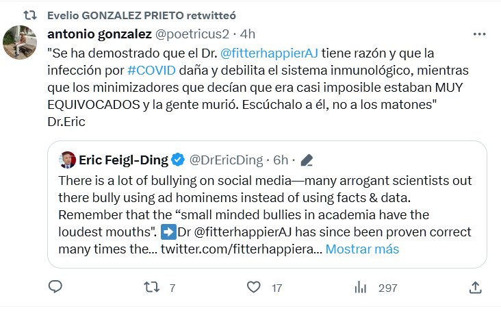 «Se ha demostrado que el Dr. @fitterhappierAJ tiene razón y que la infección por #COVID daña y debilita el sistema inmunológico, mientras que los minimizadores que decían que era casi imposible estaban MUY EQUIVOCADOS y la gente murió. Escúchalo a él, no a los matones» Dr.Eric