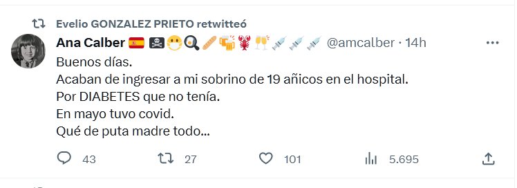 TESTIMONIOS Buenos días. Acaban de ingresar a mi sobrino de 19 añicos en el hospital. Por DIABETES que no tenía. En mayo tuvo covid. Qué de puta madre todo… Posted on julio 26, 2023 por coronado