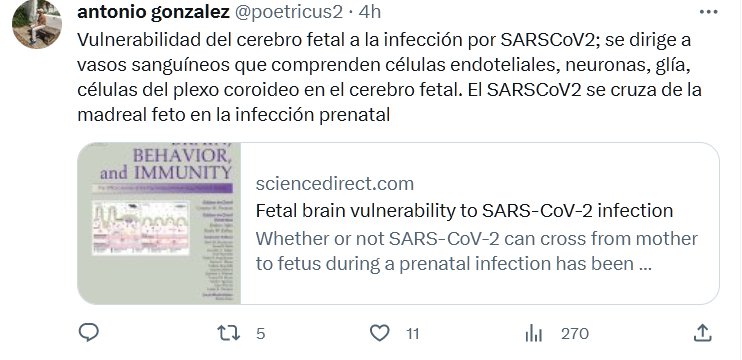 Vulnerabilidad del cerebro fetal a la infección por SARSCoV2; se dirige a vasos sanguíneos que comprenden células endoteliales, neuronas, glía, células del plexo coroideo en el cerebro fetal. El SARSCoV2 se cruza de la madre al feto en la infección prenatal