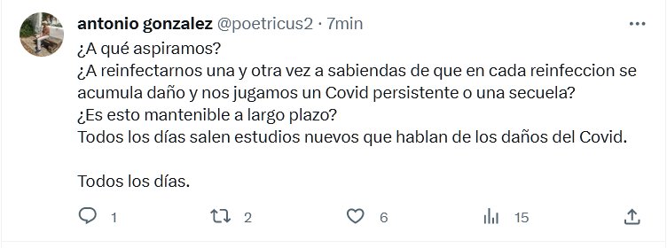 ¿A qué aspiramos? ¿A reinfectarnos una y otra vez a sabiendas de que en cada reinfeccion se acumula daño y nos jugamos un Covid persistente o una secuela? ¿Es esto mantenible a largo plazo? Todos los días salen estudios nuevos que hablan de los daños del Covid. Todos los días.