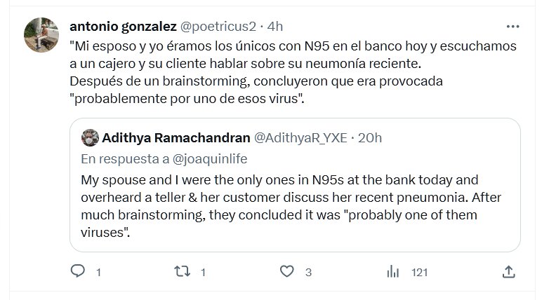 TESTIMONIOS «Mi esposo y yo éramos los únicos con N95 en el banco hoy y escuchamos a un cajero y su cliente hablar sobre su neumonía reciente. Después de un brainstorming, concluyeron que era provocada «probablemente por uno de esos virus».