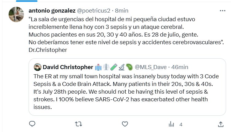 NOCOVID Y POSTCOVID HACEN ESTRAGOS «La sala de urgencias del hospital de mi pequeña ciudad estuvo increíblemente llena hoy con 3 sepsis y un ataque cerebral. Muchos pacientes en sus 20, 30 y 40 años. Es 28 de julio, gente. No deberíamos tener este nivel de sepsis y accidentes cerebrovasculares». Dr.Christopher