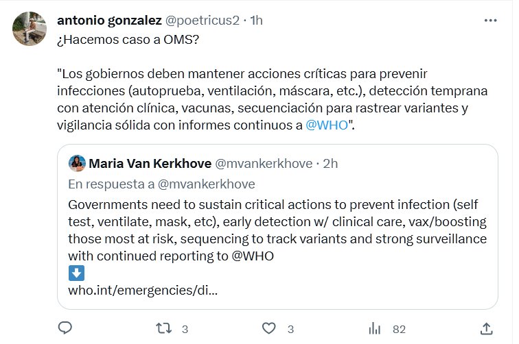 EL DOBLEMENSAJISMO ES UN CRIMEN ¿Hacemos caso a OMS? «Los gobiernos deben mantener acciones críticas para prevenir infecciones (autoprueba, ventilación, máscara, etc.), detección temprana con atención clínica, vacunas, secuenciación para rastrear variantes y vigilancia sólida con informes continuos a @WHO «.
