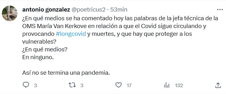 ¿En qué medios se ha comentado hoy las palabras de la jefa técnica de la OMS María Van Kerkove en relación a que el Covid sigue circulando y provocando #longcovid y muertes, y que hay que proteger a los vulnerables? ¿En qué medios? En ninguno. Así no se termina una pandemia.