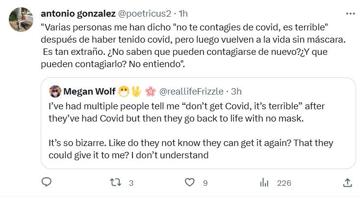 «Varias personas me han dicho «no te contagies de covid, es terrible» después de haber tenido covid, pero luego vuelven a la vida sin máscara. Es tan extraño. ¿No saben que pueden contagiarse de nuevo?¿Y que pueden contagiarlo? No entiendo».