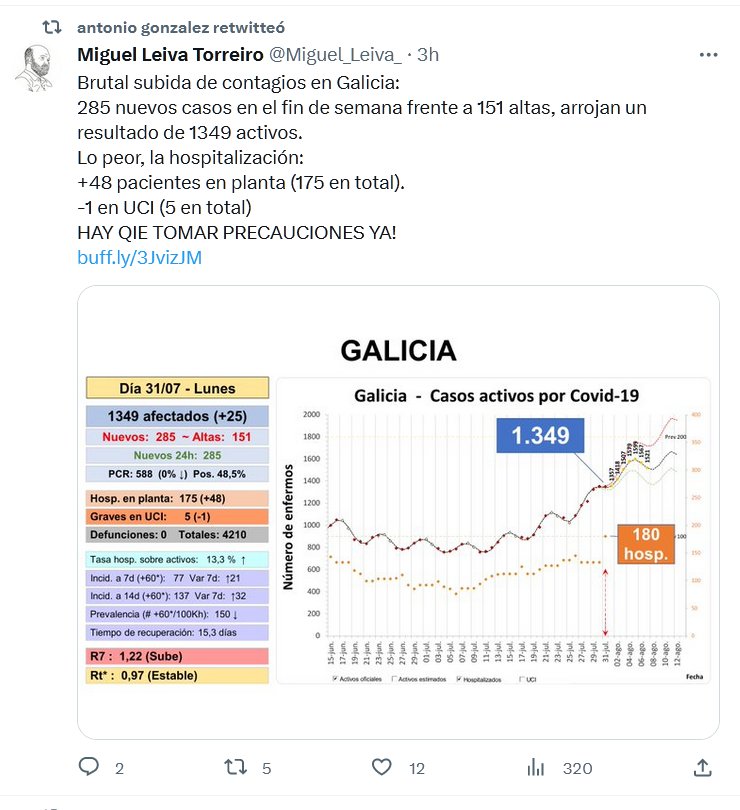 Brutal subida de contagios en Galicia: 285 nuevos casos en el fin de semana frente a 151 altas, arrojan un resultado de 1349 activos. Lo peor, la hospitalización: +48 pacientes en planta (175 en total). -1 en UCI (5 en total) HAY QIE TOMAR PRECAUCIONES YA!
