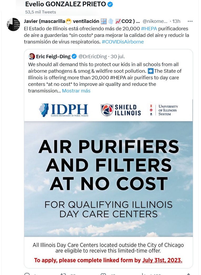 El Estado de Illinois está ofreciendo más de 20,000 #HEPA purificadores de aire a guarderías *sin costo* para mejorar la calidad del aire y reducir la transmisión de virus respiratorios. #COVIDisAirborne