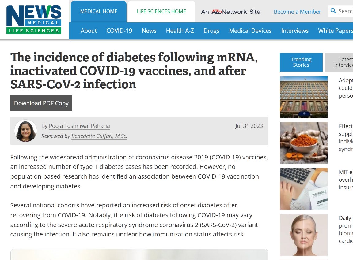 EN INGLÉS La incidencia de diabetes después de ARNm, vacunas COVID-19 inactivadas y después de la infección por SARS-CoV-2 Posted on julio 31, 2023 por coronado https://www.news-medical.net/news/20230731/The-incidence-of-diabetes-following-mRNA-inactivated-COVID-19-vaccines-and-after-SARS-CoV-2-infection.aspx