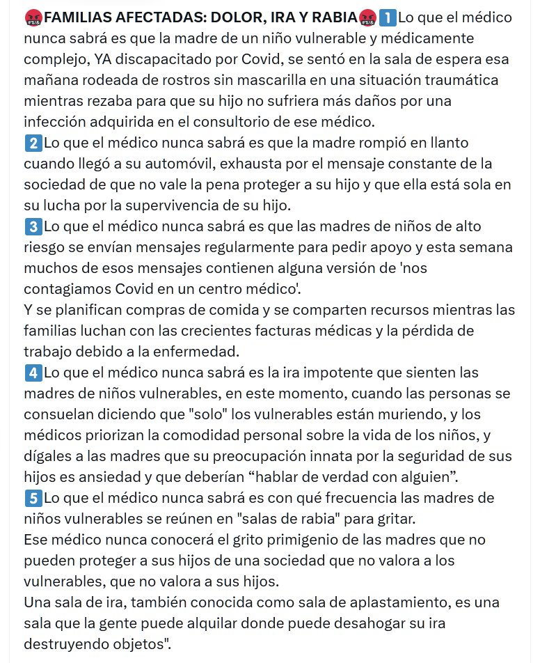 TESTIMONIOS 🤬FAMILIAS AFECTADAS: DOLOR, IRA Y RABIA🤬1⃣Lo que el médico nunca sabrá es que la madre de un niño vulnerable y médicamente complejo, YA discapacitado por Covid, se sentó en la sala de espera esa mañana rodeada de rostros sin mascarilla en una situación traumática mientras rezaba para que su hijo no sufriera más daños por una infección adquirida en el consultorio de ese médico.