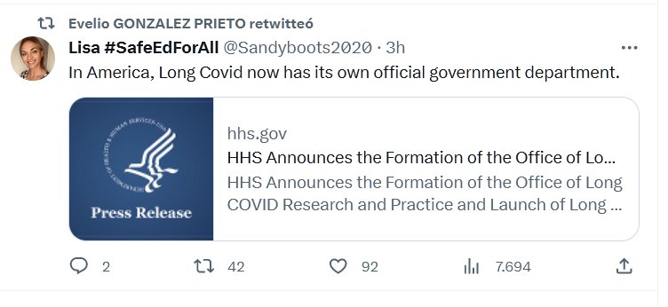 EN INGLÉS En Estados Unidos, Long Covid ahora tiene su propio departamento gubernamental oficial. Posted on agosto 1, 2023 por coronado https://www.hhs.gov/about/news/2023/07/31/hhs-announces-formation-office-long-covid-research-practice-launch-long-covid-clinical-trials-through-recover-initiative.html
