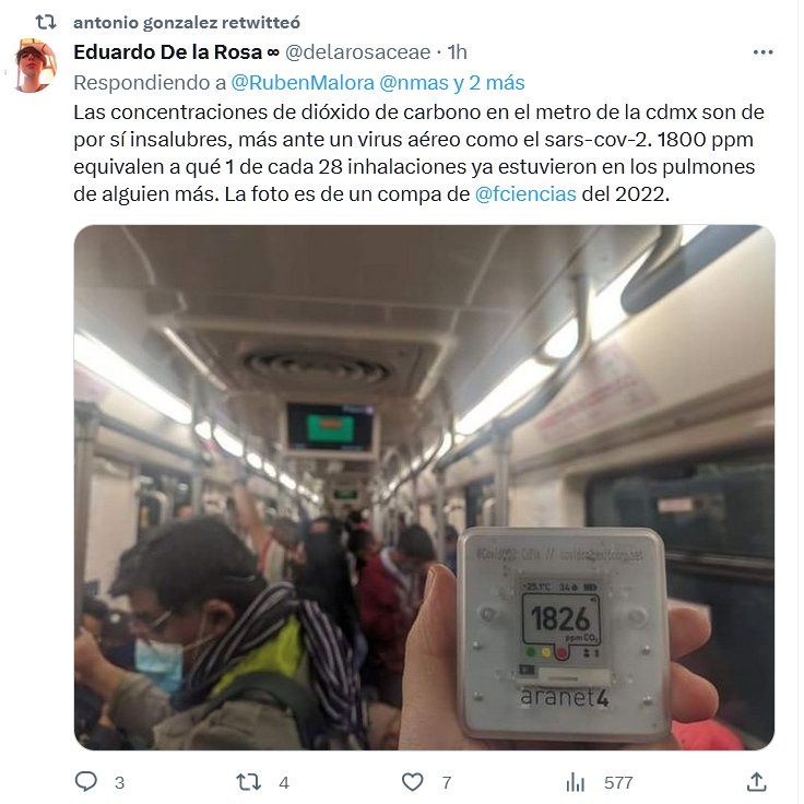 Las concentraciones de dióxido de carbono en el metro de la cdmx son de por sí insalubres, más ante un virus aéreo como el sars-cov-2. 1800 ppm equivalen a qué 1 de cada 28 inhalaciones ya estuvieron en los pulmones de alguien más. La foto es de un compa de @fciencias del 2022.