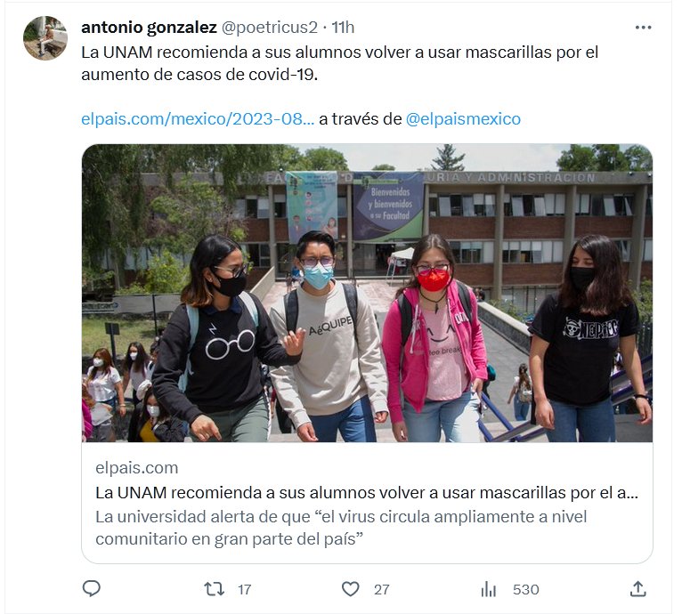 MÉXICO La UNAM recomienda a sus alumnos volver a usar mascarillas por el aumento de casos de covid-19 Posted on agosto 1, 2023 por coronado
