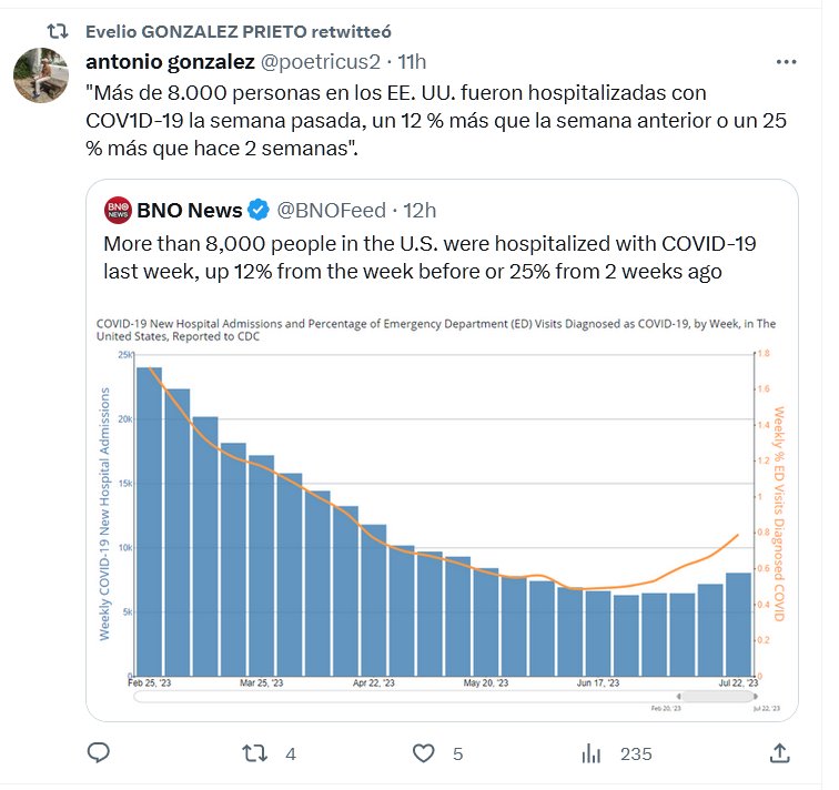 OJO QUE REPUNTA! «Más de 8.000 personas en los EE. UU. fueron hospitalizadas con COV1D-19 la semana pasada, un 12 % más que la semana anterior o un 25 % más que hace 2 semanas». Posted on agosto 1, 2023 por coronado