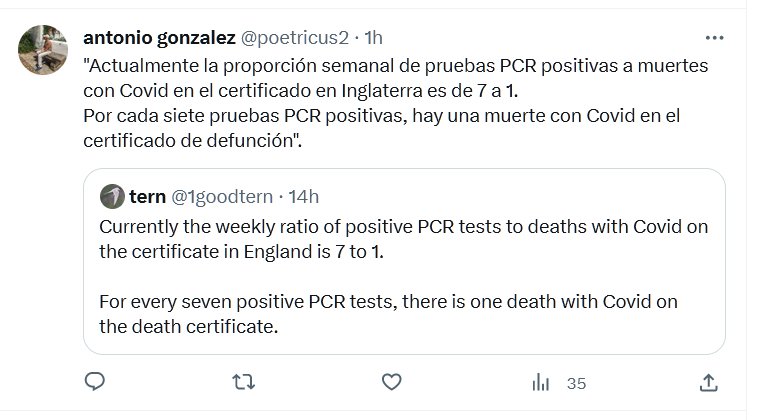 «ES LEVE» «Actualmente la proporción semanal de pruebas PCR positivas a muertes con Covid en el certificado en Inglaterra es de 7 a 1. Por cada siete pruebas PCR positivas, hay una muerte con Covid en el certificado de defunción».