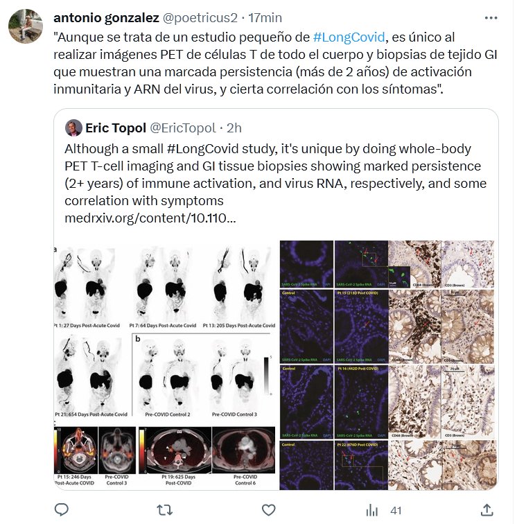 «Aunque se trata de un estudio pequeño de #LongCovid, es único al realizar imágenes PET de células T de todo el cuerpo y biopsias de tejido GI que muestran una marcada persistencia (más de 2 años) de activación inmunitaria y ARN del virus, y cierta correlación con los síntomas».