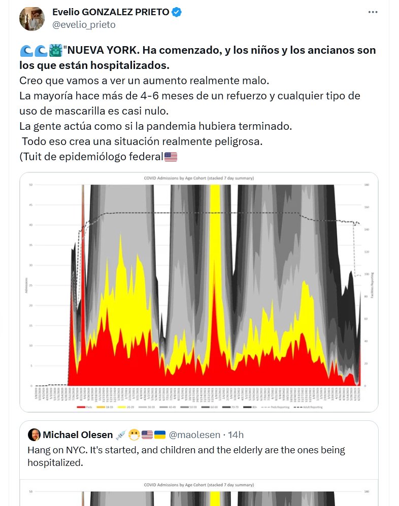 COVID 🌊🌊🗽»NUEVA YORK. Ha comenzado, y los niños y los ancianos son los que están hospitalizados. Creo que vamos a ver un aumento realmente malo. La mayoría hace más de 4-6 meses de un refuerzo y cualquier tipo de uso de mascarilla es casi nulo. La gente actúa como si la pandemia hubiera terminado. Todo eso crea una situación realmente peligrosa. (Tuit de epidemiólogo federal🇺🇸)