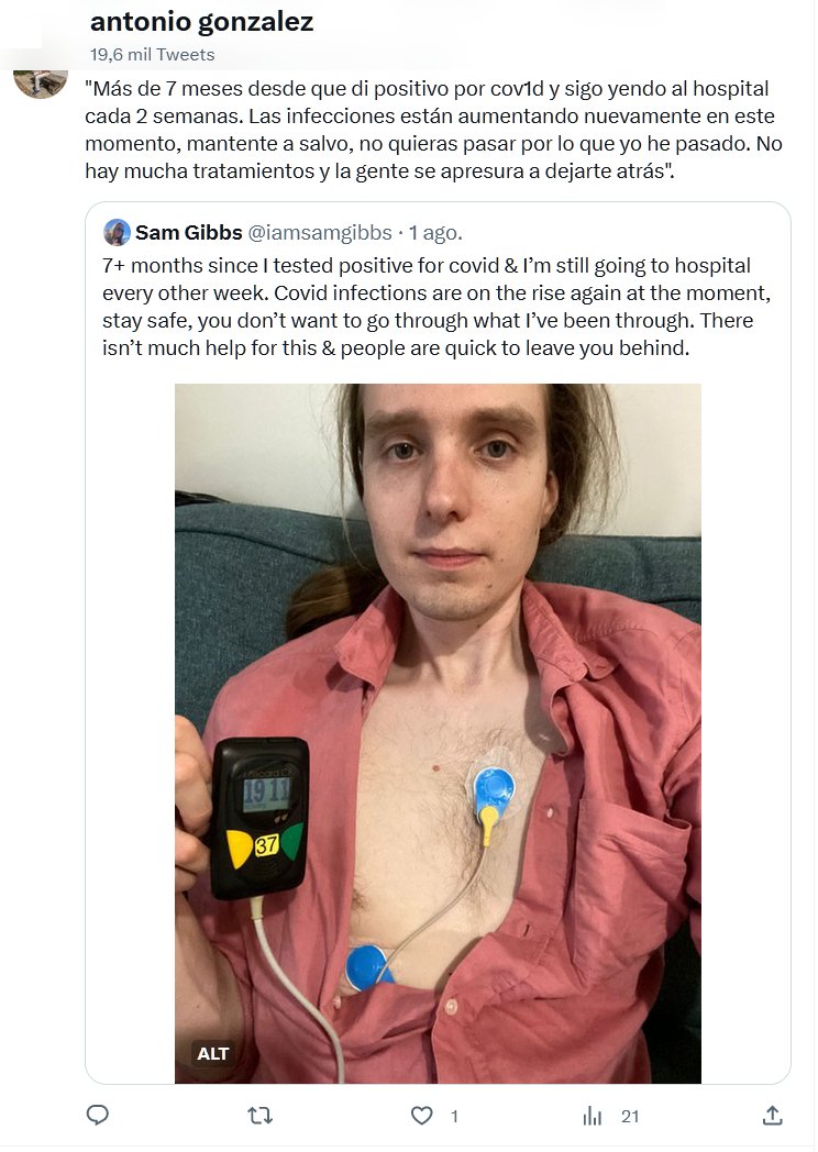 «Más de 7 meses desde que di positivo por covid y sigo yendo al hospital cada 2 semanas. Las infecciones están aumentando nuevamente en este momento, mantente a salvo, no quieras pasar por lo que yo he pasado. No hay mucha tratamientos y la gente se apresura a dejarte atrás».