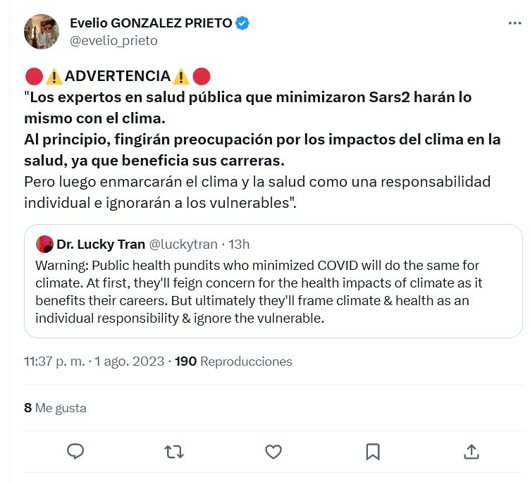 MODUS OPERANDI 🔴⚠️ADVERTENCIA⚠️🔴 «Los expertos en salud pública que minimizaron Sars2 harán lo mismo con el clima. Al principio, fingirán preocupación por los impactos del clima en la salud, ya que beneficia sus carreras. Pero luego enmarcarán el clima y la salud como una responsabilidad individual e ignorarán a los vulnerables».