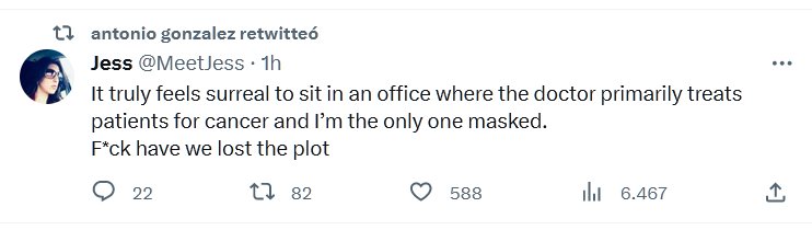 TESTIMONIOS (EN INGLÉS) Es realmente surrealista sentarse en una consulta en la que el médico trata principalmente a pacientes de cáncer y yo soy la única enmascarada. Joder, hemos perdido el rumbo.