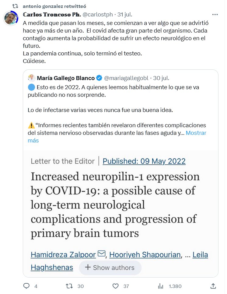 A medida que pasan los meses, se comienzan a ver algo que se advirtió hace ya más de un año. El covid afecta gran parte del organismo. Cada contagio aumenta la probabilidad de sufrir un efecto neurológico en el futuro. La pandemia continua, solo terminó el testeo. Cúidese.