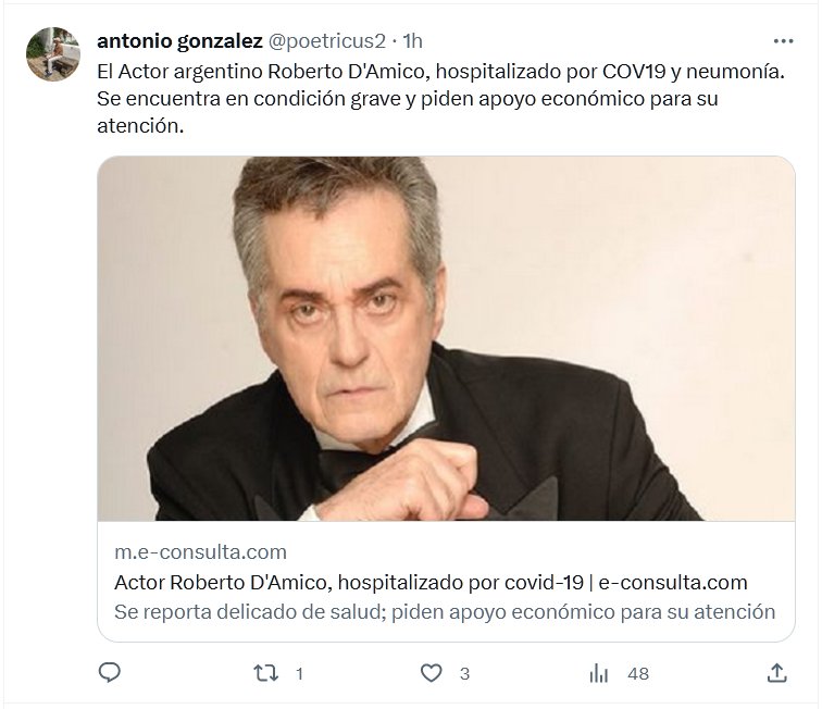 El Actor argentino Roberto D’Amico, hospitalizado por COV19 y neumonía. Se encuentra en condición grave y piden apoyo económico para su atención. Posted on agosto 3, 2023 por coronado
