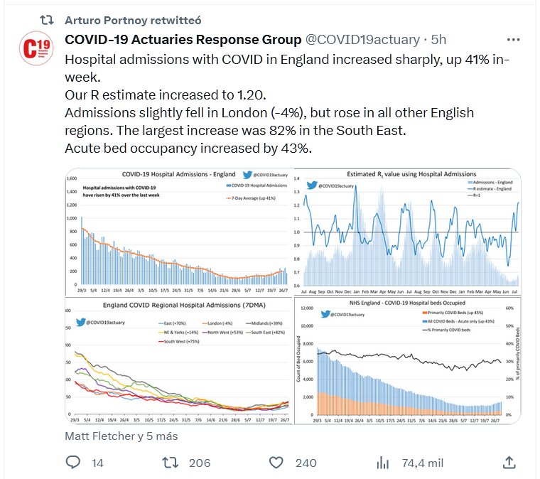 EN INGLÉS Las admisiones hospitalarias con COVID en Inglaterra aumentaron considerablemente, hasta un 41% en la semana. Nuestra estimación de R aumentó a 1,20. Las admisiones cayeron ligeramente en Londres (-4 %), pero aumentaron en todas las demás regiones inglesas. El mayor aumento fue del 82% en el sureste. La ocupación de camas agudas aumentó un 43%.
