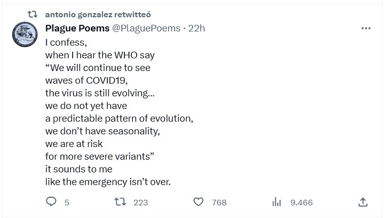 EN INGLÉS Yo confieso, cuando escucho a la OMS decir “Seguiremos viendo oleadas de covid19, el virus sigue evolucionando… aun no tenemos un patrón predecible de evolución, no tenemos estacionalidad, estamos en riesgo para variantes más severas” me suena como si la emergencia no hubiera terminado.