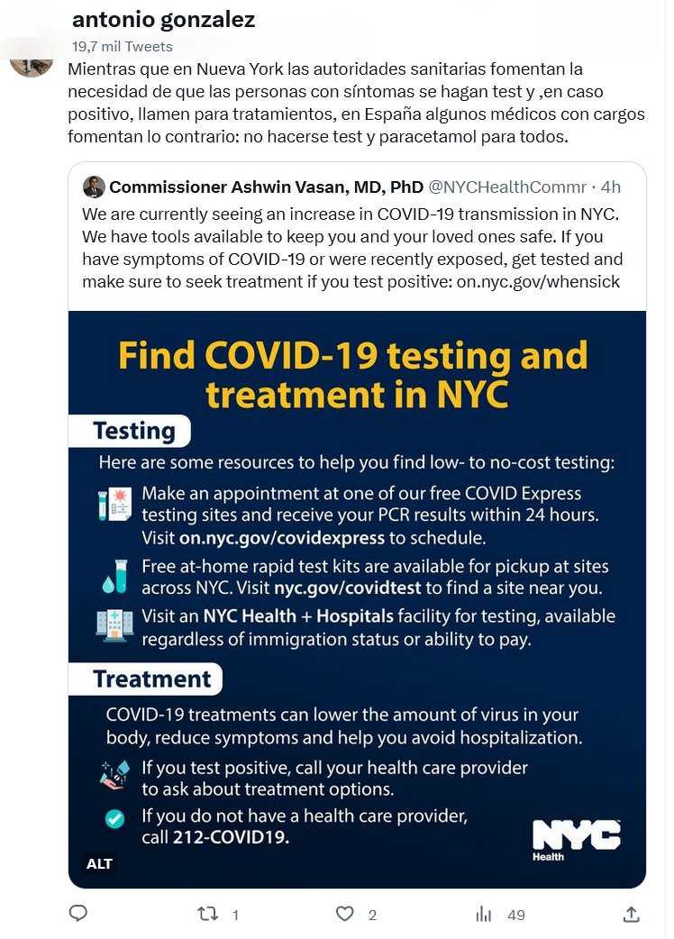 Mientras que en Nueva York las autoridades sanitarias fomentan la necesidad de que las personas con síntomas se hagan test y ,en caso positivo, llamen para tratamientos, en España algunos médicos con cargos fomentan lo contrario: no hacerse test y paracetamol para todos.