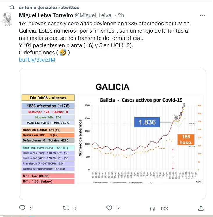 COVID-19 174 nuevos casos y cero altas devienen en 1836 afectados por CV en Galicia. Estos números -por sí mismos-, son un reflejo de la fantasía minimalista que se nos transmite de forma oficial. Y 181 pacientes en planta (+6) y 5 en UCI (+2). 0 defunciones ( 🤣 )
